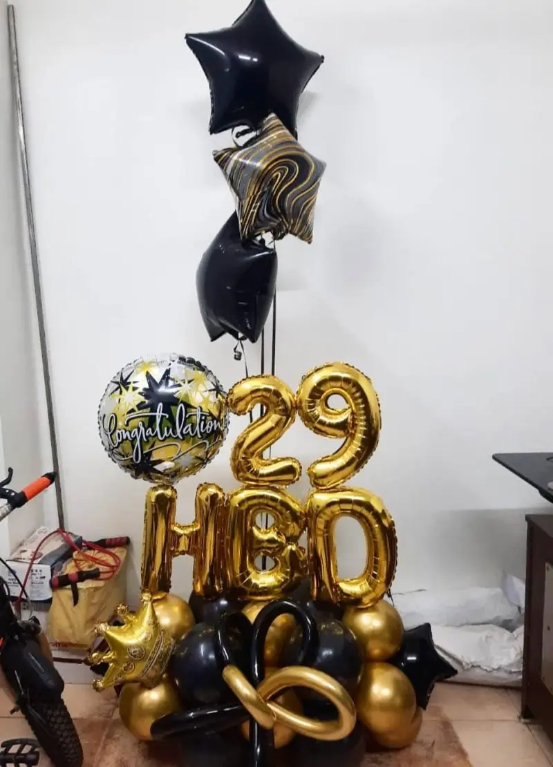Make your 29th birthday celebration extra special with our stylish and compact Birthday Balloon Bouquet Decoration. Designed with a classy black and gold theme, this bouquet setup adds a premium touch to your celebration while keeping it simple and elegant.