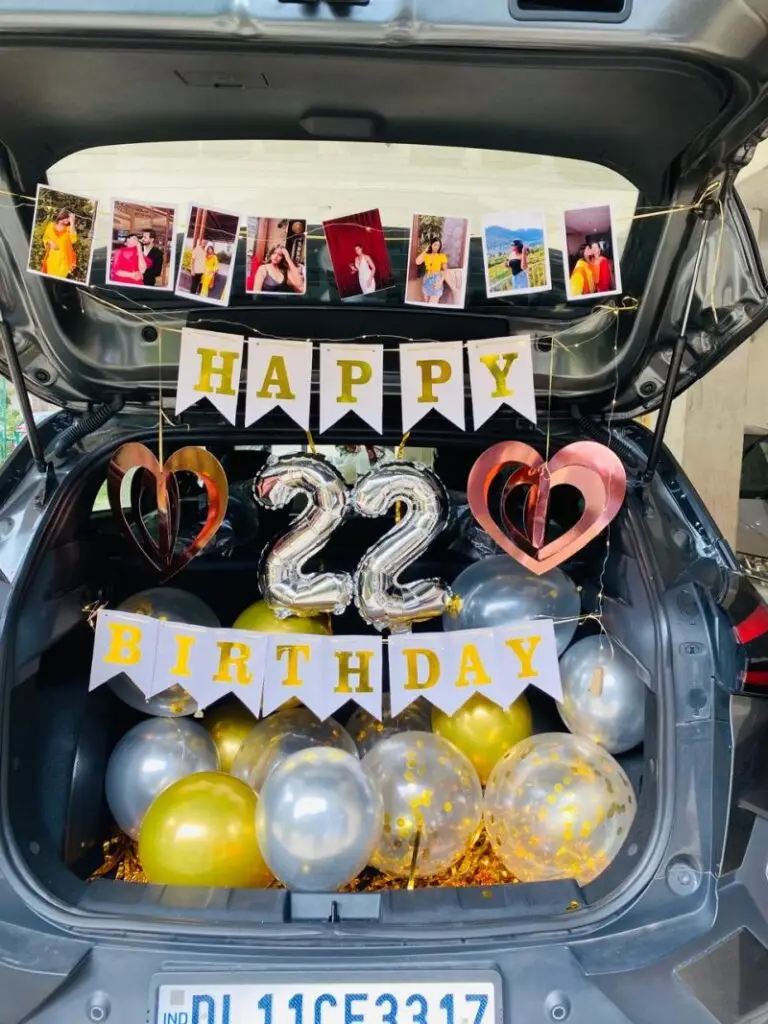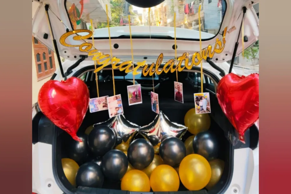 Celebrate someone’s achievement with this beautiful car boot decoration. It’s a perfect surprise for occasions like a promotion, a new job, or any special milestone. The balloons, photos, and fairy lights create a joyful and memorable moment when the car boot opens. 🎉✨🚗
