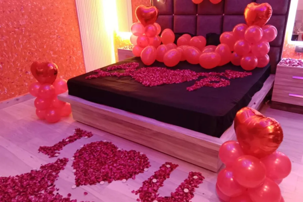 Surprise the newly married couple with this beautiful and romantic room decoration. The combination of red balloons, heart foils, glowing candles, and fresh rose petals creates a dreamy and intimate atmosphere, making their first night even more special and memorable. ❤️✨