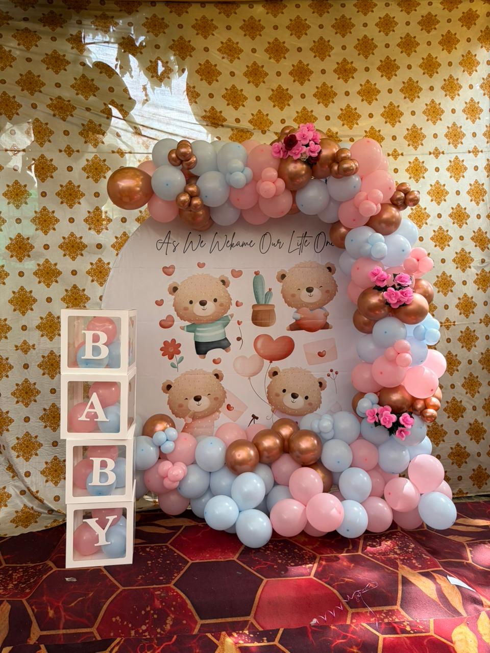 Perfect for baby showers, godh bharai, and mom-to-be surprises, this setup combines soft pastel tones with stylish metallic accents to deliver a premium and memorable experience.