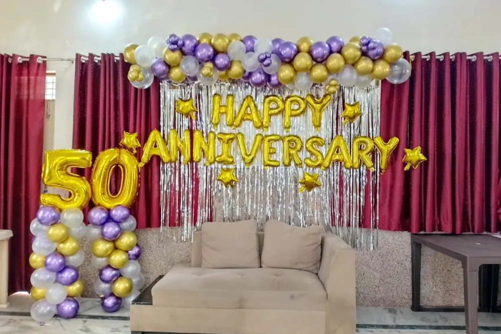 Celebrate your anniversary with this elegant purple and golden backdrop decoration. The beautiful balloon arch, shiny metallic curtains, and star foils create a stunning setup that adds charm to your celebration. It’s a perfect decoration to make your special milestone feel grand and memorable while celebrating years of love and togetherness. 💜✨🎉