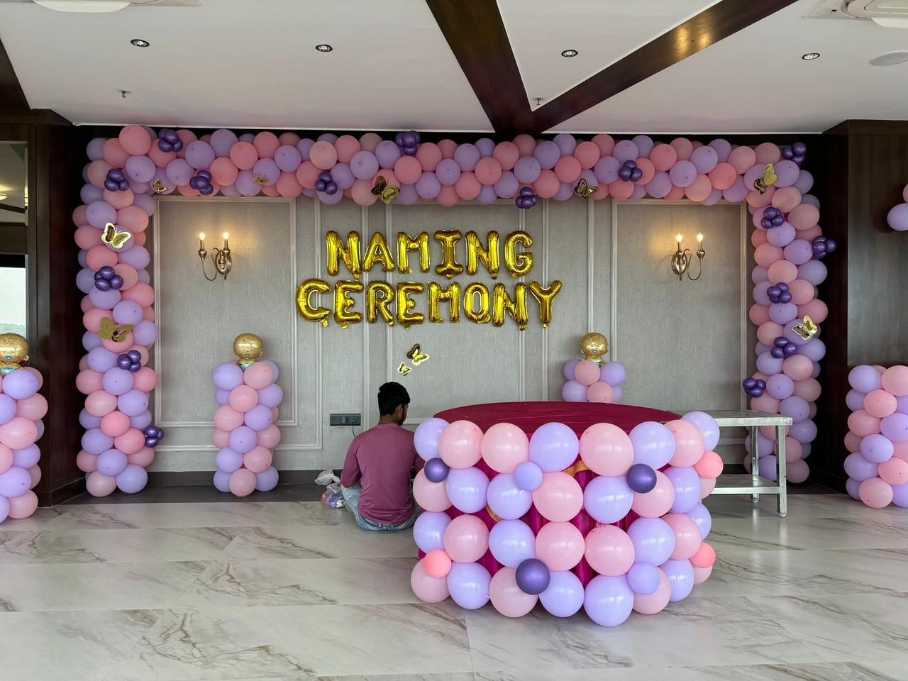 Our expert decorators craft a beautiful setup featuring a customized backdrop with “Welcome Baby” or your baby’s name, along with premium balloon arrangements in soft pastel shades or vibrant themes. The décor includes balloon garlands, foil balloons, and stylish curtains or panels that add a charming and festive touch to your space.